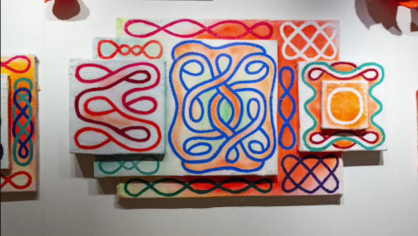 – De här målningarna är som skulpturer, det är en slags reliefer med linjekonstruktioner på som är gjorda i skulpturmaterial. På sätt och vis en humoristisk variant på målarduken. Det här är målarduken man aldrig kan spänna upp – den är skulpterad.
