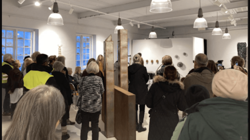 Vernissage för utställning med Kaarin Bonde Jensen och Gunnar Carl Nilsson. Slagverkskulning med Karin Ericsson Back och Pontus Langendorf (21 november, 2021).