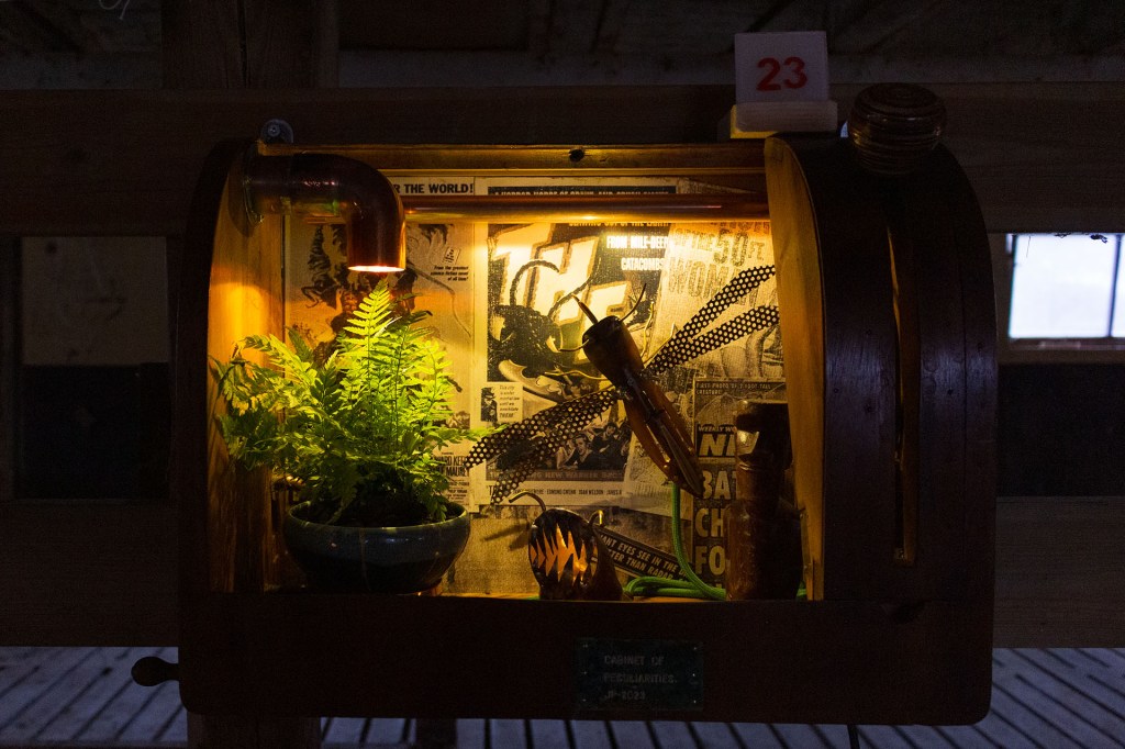 Den råa miljön i kostallet är väl vald men överraskar ändå som utställningslokal. Objekten framhävs fint av både elektriskt ljus och dagsljus silat genom ladugårdsmjölkiga fönster. Många av verken drar åt stream punk och Johnny själv kombinerar gärna äldre elektronik med organiskt material eller skapade biotoper. Persson har varken brist på idéer eller material – han har samlat på sig en hel del ting från nedlagda industrier och återvinningscontainrar. Denna gång finns också delar från gamla spelautomater i några av hans belysta objekt.