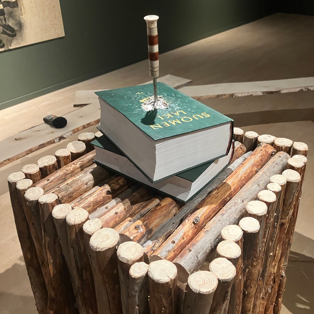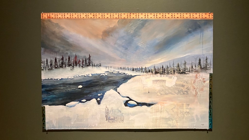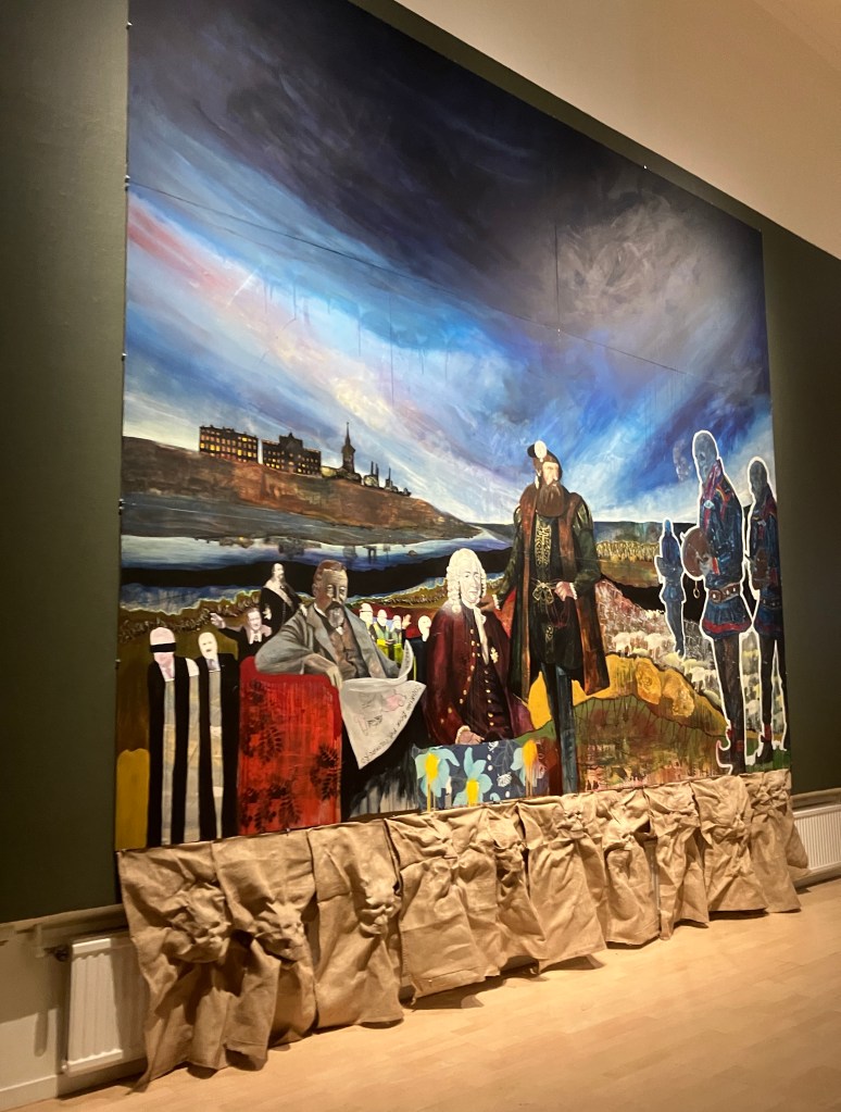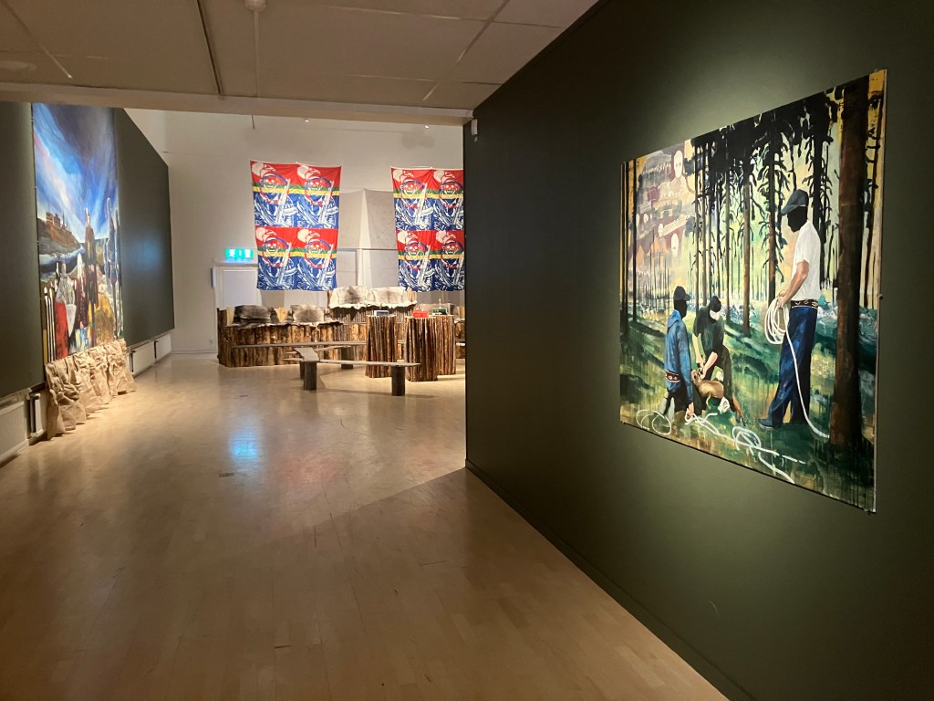 På väggen intill hänger ett monumentalt verk som är målat 2023 och därmed är det nyaste i utställningen. Men det avbildade tar oss med till äldre tider. Vi ser Carl von Linné, Gustav Vasa och Hjalmar Lundbohm, geolog och LKAB:s förste disponent. Vi ser kyrkan i Pajala, Rasbiologiska institutet, gamla riksdagshuset. På en mindre tavla ser vi samma plats som den såg ut orörd.