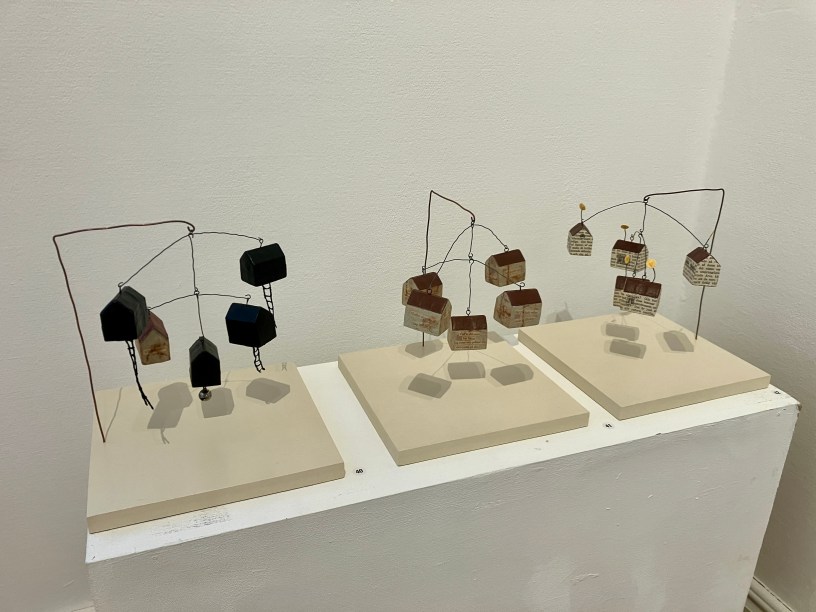 En av de populäraste serierna, 75 procent är sålda redan på vernissagedagen, är Ann-Marie Flodells akvareller Gömma nyckeln. Iann Eklund Tinbäcks semesterserie skapar skuggspel. Mobilerna fångar med sin trådbundenhet och sina titlar begränsad mobilitet: Glamping, Hemester och Borta bra men hemma bäst. Gott så. Ska vi vara kvar på jorden måste ordet semester få annan innebörd än 14 timmars koldioxiddumpning från ett plan till Thailand.