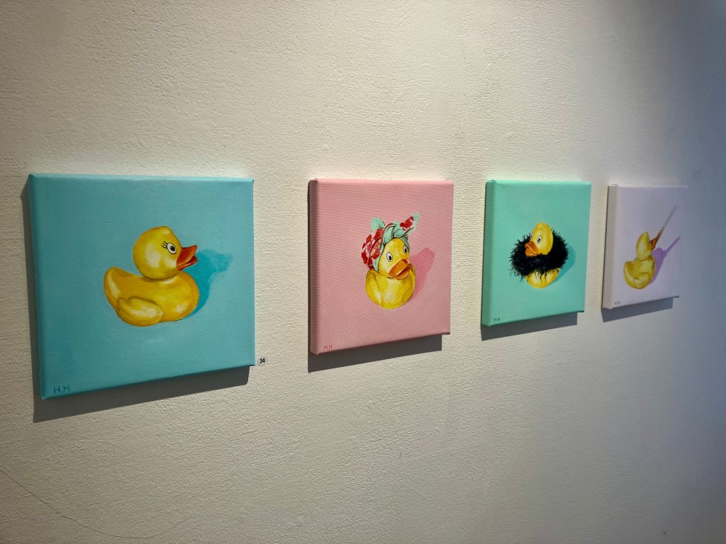 Litet format möjliggör stor uppfinningsrikedom. Vi ser badankor av Hanna Hellmér i hennes signifikativa färgskala och med sedvanlig kryddning av uppror och humor. Keramik av Lena Svensson nyttjar 20 cm och blir användbart konsthantverk i form av Ljus bärare – lampetter för värmeljus som känns direkt kompatibla med badrummets kakelplattor.