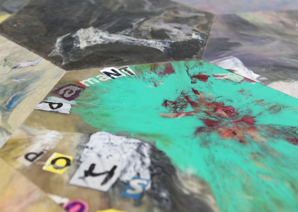 Diamant förädlar detta förpackningsskräp och försöker omvandla flodvågen av mjukplast till något annat: Vackert marmorerade hexagoner, ibland med för länge sedan försvunna logotyper eller nästintill oläsbar abstrakt dubbelexponerad ”poesi”.